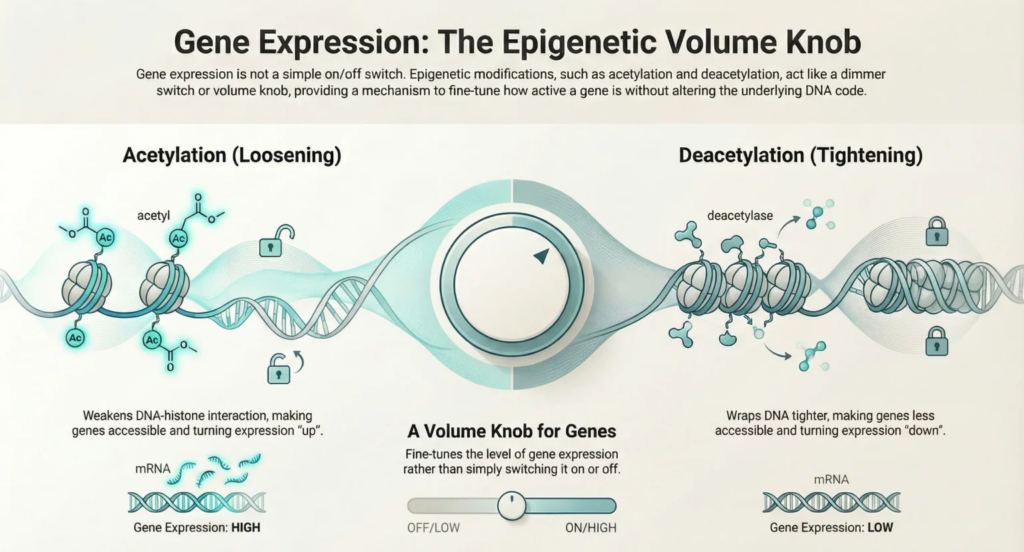 Ini bertindak seperti kenop volume, menyempurnakan tingkat ekspresi gen daripada sekadar menghidupkan atau mematikannya.