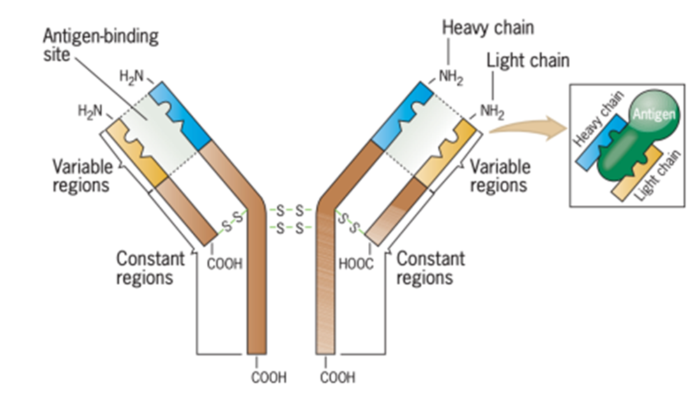 Antibodi termasuk dalam golongan protein yang disebut imunoglobulin. Setiap antibodi adalah tetramer yang terdiri dari empat polipeptida, dua light chains identik dan heavy chains identik, yang disatukan oleh ikatan disulfida (Gambar 2). Light chains panjangnya sekitar 220 asam amino, dan rantai berat panjangnya sekitar 440-450 asam amino. Setiap light and heavy chains memiliki amino-terminal variable region, di mana urutan asam amino bervariasi di antara antibodi yang spesifik untuk antigen yang berbeda, dan constant region karboksil terminal, di mana urutan asam amino sama untuk semua antibodi yang disebut kelas Imunoglobulin (Ig). Variable region dari semua rantai antibodi panjangnya sekitar 110 asam amino.