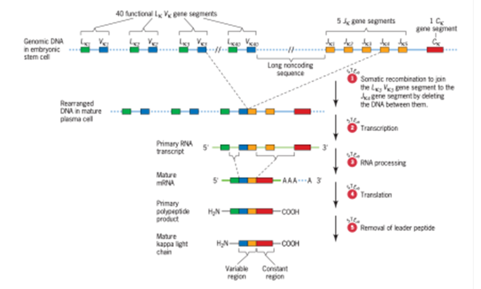 1. Segmen gen LkVk, yang mengkode leader peptida dan 95 asam amino aminoterminal dari variable region kappa light chain; leader peptida dikeluarkan dari light chains kappa melalui pembelahan setelah memandu polipeptida yang baru terbentuk melalui membran retikulum endoplasma dalam sel plasma yang mensintesis antibodi.