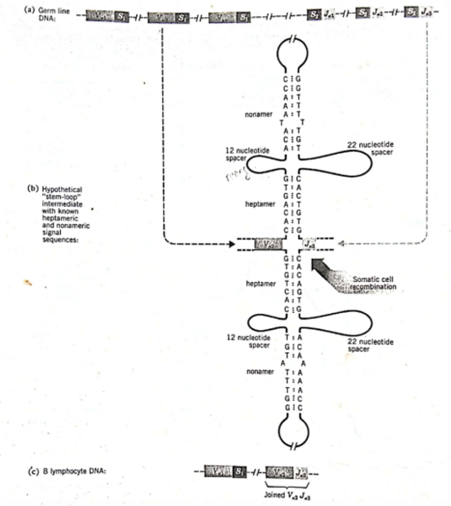 Bagaimana genome rearrangements yang terjadi selama perkembangan limfosit B diatur? Apa yang mengendalikan somatic recombination sehingga segmen gen V bergabung dengan segmen J dan bukan dengan segmen V lain atau langsung ke segmen C? Beberapa segmen panjang DNA kromosom yang membawa gugus segmen gen V, segmen gen D, dan segmen gen dari manusia kini telah diurutkan, dan urutan pasangan nukleotida yang dihasilkan menunjukkan adanya sinyal penggabungan V-J, V-D, dan D-J yang spesifik (Gambar 4). Urutan sinyal yang sama ditemukan berdekatan dengan semua segmen gen V. Demikian pula,