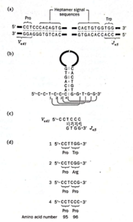 Perbandingan keragaman urutan asam amino yang ada dalam molekul antibodi dengan yang diprediksi dari urutan segmen gen yang mengode antibodi ini mengungkapkan bahwa terdapat lebih banyak variasi dalam urutan asam amino pada V-J junctions daripada urutan nukleotida. Penelitian selanjutnya menunjukkan bahwa sebagian besar keragaman tambahan ini dapat dijelaskan oleh variasi pada lokasi rekombinasi yang tepat selama peristiwa V-J joining events. Contoh penggunaan lokasi penggabungan alternatif segmen gen Vk dan Jk pada diilustrasikan dalam Gambar 5. Selama penggabungan segmen gen Vk41 dan J5, rekombinasi telah terbukti terjadi antara empat posisi nukleotida yang berdekatan di lokasi sambungan. Peristiwa rekombinasi ini menghasilkan empat urutan nukleotida berbeda yang mengode tiga asam amino berbeda pada posisi 96 dalam lights chains kappa tikus. Lebih lanjut, karena asam amino 96 terjadi di wilayah rantai antibodi yang terlibat dalam pengikatan antigen, peristiwa V-J joining events alternatif jenis ini tidak diragukan lagi berkontribusi secara signifikan terhadap keragaman spesifisitas antibodi yang diamati pada vertebrata.