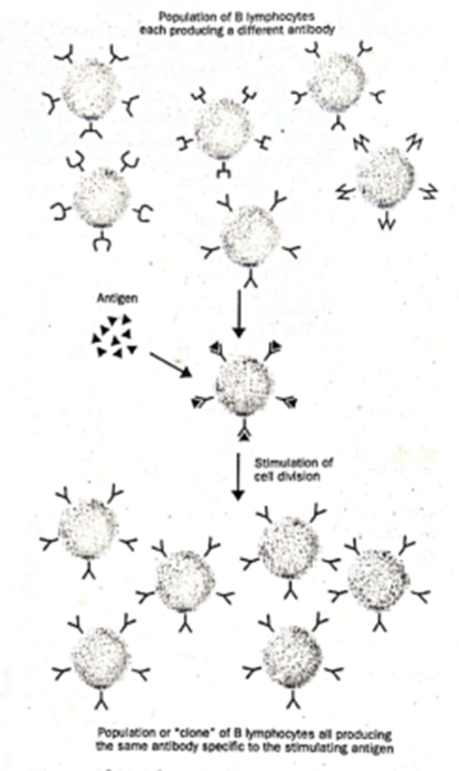 Seleksi klonal merupakan teori tentang bagaimana suatu organisme memulai sintesis antibodi yang spesifik terhadap antigen yang belum pernah ditemuinya sebelumnya. Semua antibodi yang diproduksi oleh satu limfosit B memiliki spesifitas pengikatan antigen yang sama. Namun, sel-sel yang berbeda dalam populasi limfosit B akan mengalami penataan ulang genom yang berbeda yang mengarah pada produksi antibodi dengan spesifitas yang berbeda. Dengan demikian, populasi limfosit B pada manusia atau tikus akan menghasilkan berbagai macam antibodi. Teori seleksi klonal menyatakan bahwa pengikatan antigen asing tertentu ke antibodi pada permukaan limfosit B merangsang sel tersebut untuk membelah, menghasilkan sejumlah besar limfosit B tertentu (“klon” dari sel-sel yang identik) dan dengan demikian sejumlah besar antibodi tertentu yang mengenali antigen asing (Gambar 6).