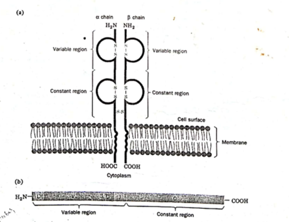 Reseptor sel T terdiri dari dua poli rantai peptida, α dan ß, masing-masing dikodekan oleh segmen gen L-V, D, J, dan C seperti rantai antibodi. Polipeptida α dan ß, seperti rantai antibodi, mengandung variable regions yang membentuk situs pengikatan antigen dan constant regions yang mengikat reseptor pada permukaan sel (Gambar 7). Variable regions reseptor sel T dikodekan oleh beberapa L-V, D, dan J, constant regions dikodekan oleh segmen gen C. Gen reseptor sel T disusun oleh genomic rearrangements yang terjadi selama diferensiasi limfosit T dari sel induk seperti halnya gen antibodi dalam limfosit B yang sedang berkembang. Protein reseptor α dan ß, dikodekan oleh segmen gen yang berjejer dalam kelompok, pada kromosom yang mirip dengan yang mengkode rantai antibodi. Pada manusia, kelompok segmen gen α dan ß, masing-masing terletak pada kromosom 14 dan 7. (Kelompok segmen gen lain mengkode jenis ketiga polipeptida reseptor sel T yang disebut γ yang terdapat pada jenis sel T tertentu. Ada beberapa jenis sel T berbeda yang menjalankan fungsi berbeda selama respons imun.)
