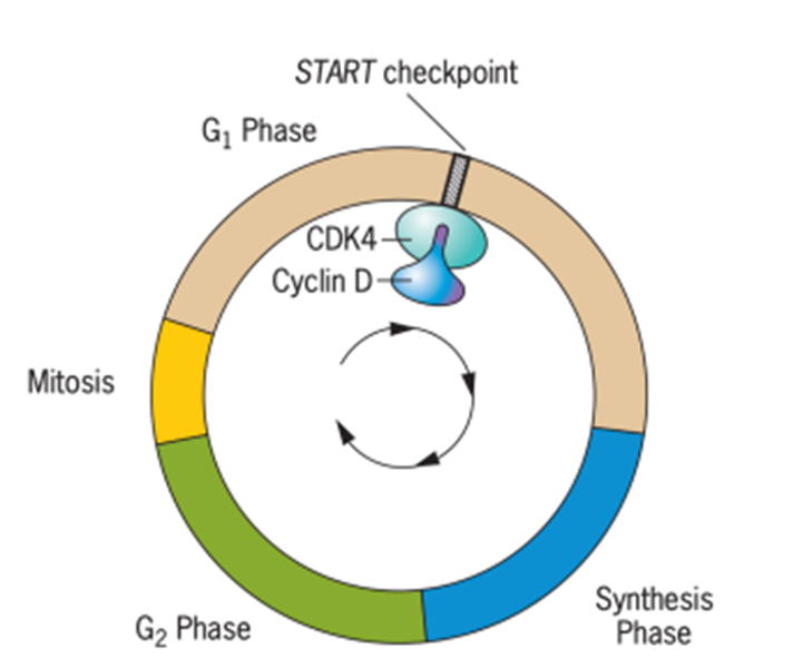 Salah satu checkpoints siklus sel yang paling penting, disebut START, berada di pertengahan G1. Sel menerima sinyal eksternal dan internal di checkpoints ini untuk menentukan kapan waktu yang tepat untuk pindah ke fase S. Titik pemeriksaan ini diatur oleh siklin tipe D bersama dengan CDK4. Jika sel didorong melewati titik pemeriksaan START oleh kompleks siklin D/CDK4, sel tersebut berkomitmen pada putaran replikasi DNA lainnya. Protein penghambat dengan kemampuan merasakan masalah pada fase G1 akhir, seperti kadar nutrisi yang rendah atau kerusakan DNA, dapat mengerem kompleks siklin/CDK dan mencegah sel memasuki fase S. Jika tidak ada masalah seperti itu, kompleks siklin D/CDK4 mendorong sel melewati akhir fase G1 dan memasuki fase S, dengan demikian memulai replikasi DNA yang merupakan awal dari pembelahan sel.