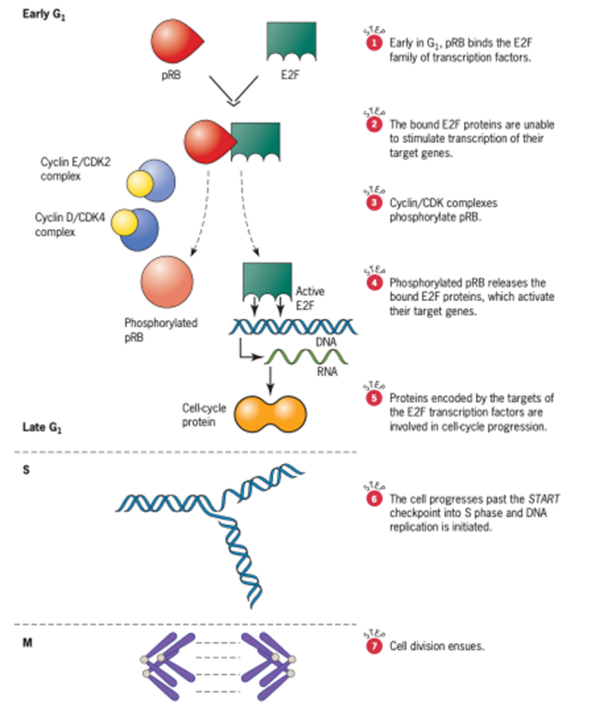 Analisis molekular dan biokimia telah menjelaskan peran pRB dalam regulasi siklus sel (Gambar 9). Pada awal fase G1 siklus sel, pRB mengikat protein E2F, faktor transkripsi yang mengendalikan ekspresi beberapa gen yang produknya menggerakkan sel melalui siklusnya. Ketika faktor transkripsi E2F terikat pada pRB, mereka tidak dapat mengikat urutan penambah spesifik dalam gen targetnya. Akibatnya, faktor siklus sel yang dikodekan oleh gen-gen ini tidak diproduksi, dan mesin untuk sintesis DNA dan pembelahan sel tetap diam. Kemudian pada G1, pRB difosforilasi melalui aksi kinase yang bergantung pada siklin. Dalam keadaan yang berubah ini, pRB melepaskan faktor transkripsi E2F yang telah terikat padanya. Faktor transkripsi yang dilepaskan ini kemudian bebas untuk mengaktifkan gen targetnya, yang mengkode protein yang menginduksi sel untuk maju melalui fase S dan menjadi mitosis. Setelah mitosis, pRB didefosforilasi, dan masing-masing sel anak memasuki fase diam dari siklus sel baru.