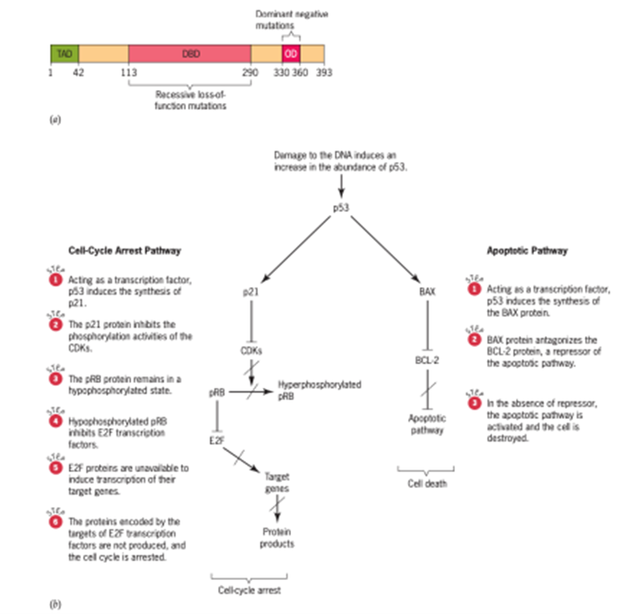 Protein p53 adalah faktor transkripsi sepanjang 393 asam amino yang terdiri dari tiga domain berbeda: N-terminal transcription-activation domain (TAD), DNA-binding core domain (DBD), dan C-terminal homo-oligomerization domain (OD). Sebagian besar mutasi yang menonaktifkan p53 terletak di DBD. Mutasi ini jelas merusak atau menghilangkan kemampuan p53 untuk mengikat urutan DNA spesifik yang tertanam dalam gen targetnya, sehingga mencegah aktivasi transkripsi gen-gen ini. Dengan demikian, mutasi pada DBD biasanya merupakan mutasi kehilangan fungsi resesif. Jenis mutasi lainnya ditemukan di bagian OD dari polipeptida. Molekul p53 dengan jenis mutasi ini dimerisasi dengan polipeptida p53 wild-type dan mencegah polipeptida wild-type berfungsi sebagai aktivator transkripsi. Dengan demikian, mutasi pada OD memiliki efek negatif dominan pada fungsi p53.