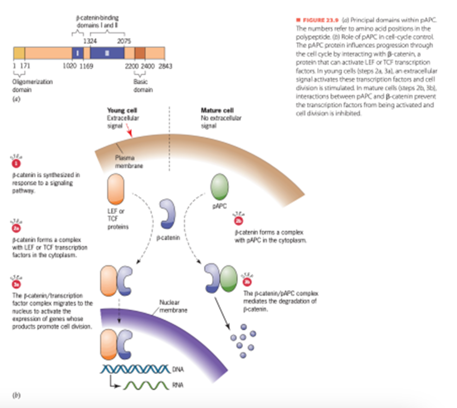 Selain itu, protein pAPC mengatur pembelahan sel melalui kemampuannya untuk mengikat β-catenin, protein yang ada di dalam sel. β-catenin secara alami juga mengikat protein lain, termasuk faktor transkripsi tertentu yang merangsang ekspresi gen yang produk proteinnya mendorong pembelahan sel. Interaksi dengan faktor transkripsi ini disukai ketika sinyal yang mengenai permukaan sel memberi isyarat kepada sel untuk membelah (Gambar 11). Proliferasi sel yang diinduksi sinyal merupakan proses yang diperlukan dalam epitel usus karena jaringan ini kehilangan sejumlah besar sel setiap hari pada manusia, sekitar 1011dan sel yang hilang harus digantikan oleh sel baru yang dihasilkan oleh pembelahan. Biasanya, sel-sel yang baru dibuat kehilangan kemampuan untuk membelah saat mereka menjauh dari bagian generatif epitel dan mengasumsikan peran mereka di bagian epitel yang matang. Pergeseran dari keadaan membelah menjadi tidak membelah terjadi karena sel-sel epitel yang matang tidak menerima sinyal ekstraseluler yang merangsang sel untuk membelah. Dengan tidak adanya
