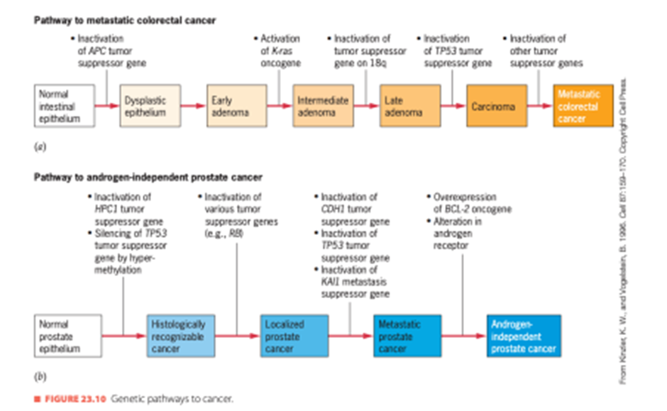 Jalur genetik menuju kanker prostat juga telah dijelaskan Gambar 12b. Mutasi pada HPC1, gen untuk kanker prostat herediter yang terletak di lengan panjang kromosom 1, telah terlibat dalam asal tumor prostat. Mutasi pada gen penekan tumor lain yang terletak di kromosom 13, 16, 17, dan 18 dapat mengubah tumor prostat menjadi kanker metastasis, dan ekspresi berlebihan gen protoonkogen BCL-2 dapat membuat kanker ini kebal terhadap terapi deprivasi androgen, teknik standar untuk pengobatan kanker prostat. Hormon steroid andro