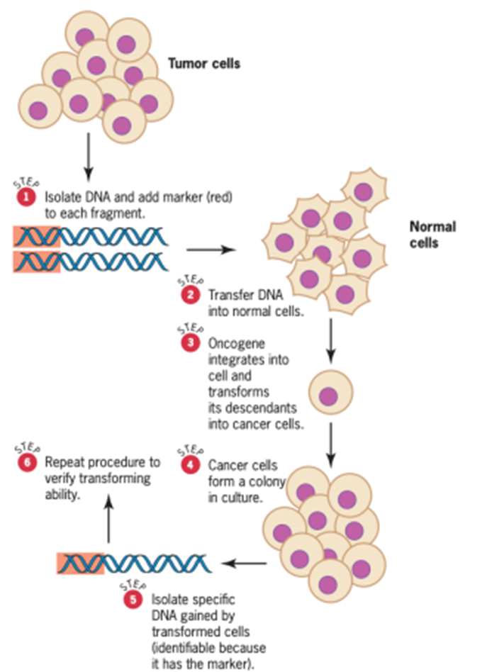 DNA diekstraksi dari jaringan kanker dan difragmentasi; kemudian setiap segmen disambungkan ke segmen DNA bakteri, yang berfungsi sebagai penanda molekuler. Fragmen DNA yang ditandai kemudian dimasukkan, atau ditransfeksi, ke dalam sel yang tumbuh dalam kultur untuk menentukan apakah ada segmen yang dapat mengubah sel menjadi keadaan kanker. Keadaan ini dapat dikenali dari kecenderungan sel kanker untuk membentuk gumpalan kecil, atau fokus, saat tumbuh soft agar plates. DNA dari sel-sel tersebut diekstraksi dan disaring untuk melihat apakah membawa penanda molekuler yang terkait dengan fragmen transfeksi asli. Jika ya, DNA ini diuji ulang untuk kemampuannya menginduksi keadaan kanker. Setelah beberapa pengujian, tim peneliti Weinberg mengidentifikasi fragmen DNA dari kanker kandung kemih asli yang secara reproduktif mengubah sel kultur menjadi sel kanker. Fragmen ini membawa alel onkogen c-H-ras, homolog onkogen dalam galur Harvey dari virus sarkoma tikus. Analisis urutan DNA kemudian menunjukkan bahwa nukleotida dalam kodon 12 dari alel ini telah bermutasi, dengan substitusi valin untuk glisin yang biasanya ditemukan pada posisi ini dalam protein c-H-ras.