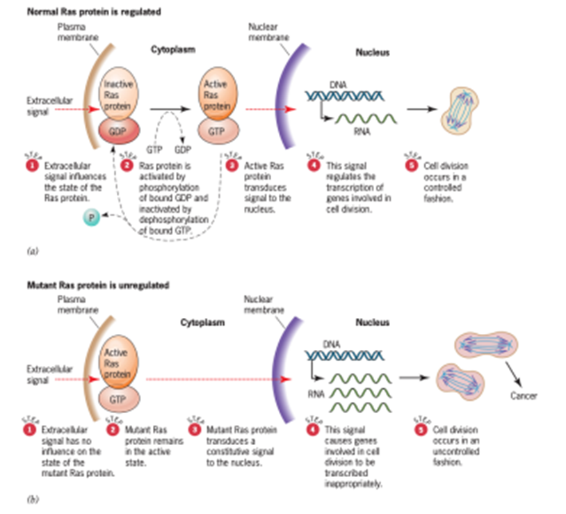 Ahli genetika kini memiliki pemahaman tentang bagaimana mutasi ini menyebabkan sel menjadi kanker. Tidak seperti onkogen virus, gen c-H-ras mutan tidak mensintesis protein dalam jumlah besar yang tidak normal. Sebaliknya, substitusi valin untuk glisin pada posisi 12 mengganggu kemampuan protein c-H-ras mutan untuk menghidrolisis salah satu substratnya, guanosine triphosphate (GTP). Lebih lanjut, karena gangguan ini, protein mutan tetap berada dalam mode pensinyalan aktif, mengirimkan informasi yang akhirnya merangsang sel untuk membelah dengan cara yang tidak terkendali (Gambar 14).