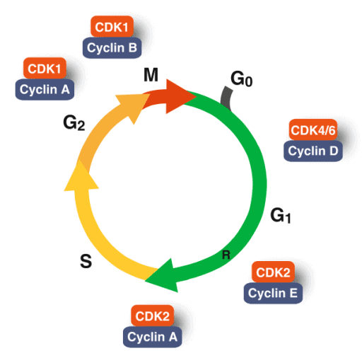 and cyclin-dependent kinases, yang sering disingkat CDK. Kompleks yang terbentuk antara siklin dan CDK menyebabkan siklus sel berlanjut.