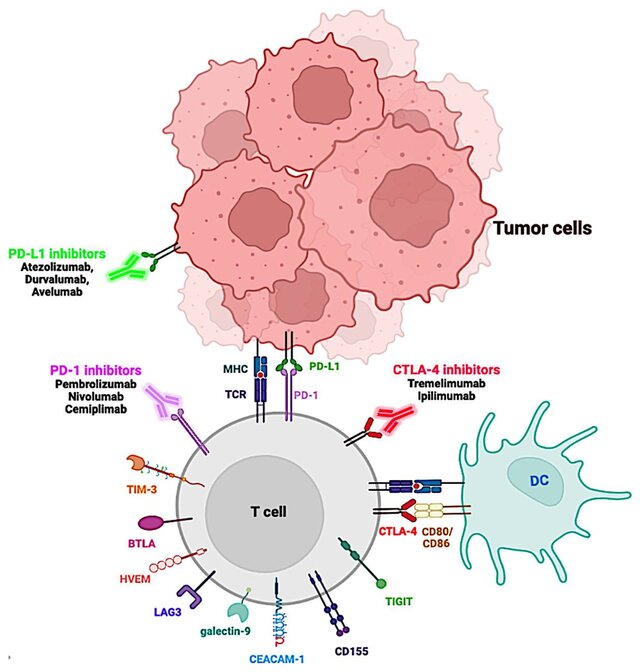 Inhibitor checkpoint imun yang disetujui FDA sebagai intervensi terapeutik dalam pengobatan kanker. Sel T diaktifkan melalui presentasi antigen oleh molekul kompleks histokompatibilitas utama (MHC) pada permukaan sel tumor atau pada sel penyaji antigen (APC) seperti sel dendritik (DC), yang dikenali oleh reseptor sel T (TCR). Sel T yang diaktifkan akan meningkatkan ekspresi reseptor permukaan sel ko-inhibitor seperti PD-1 dan CTLA-4. Pengikatan PD-1 ke ligan-ligannya, PD-L1, atau PD-L2, akan menghambat pensinyalan hilir TCR, sehingga menurunkan aktivitas sel T. Terapi antibodi yang menargetkan PD-1 atau PD-L1 dapat mengaktifkan kembali sel T yang kelelahan di lokasi tumor, meningkatkan aktivitasnya dan memungkinkan sel T untuk menghancurkan sel tumor. Pengikatan CTLA-4 ke ligan-ligannya, B7, CD80, atau CD86, menekan aktivitas sel T. Dengan memblokir interaksi CTLA-4 dengan antibodi anti-CTLA-4, proliferasi sel T akan diaktifkan.