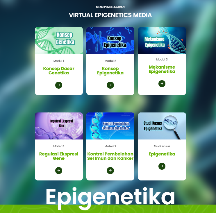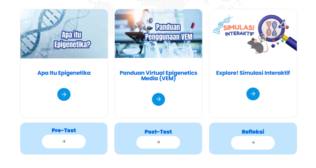 Virtual Epigenetics Media (VEM) adalah media pembelajaran interaktif yang dirancang untuk membantu mahasiswa memahami konsep epigenetika secara konseptual, visual, dan aplikatif. Melalui integrasi modul materi, studi kasus, dan simulasi virtual, VEM memungkinkan Anda mengeksplorasi bagaimana faktor lingkungan memengaruhi ekspresi gen tanpa mengubah urutan DNA. Platform ini sangat relevan bagi mahasiswa Biologi, Pendidikan Biologi, maupun bidang kesehatan karena menyajikan konsep abstrak seperti metilasi DNA dan modifikasi histon—dalam bentuk yang lebih konkret dan mudah dipahami.